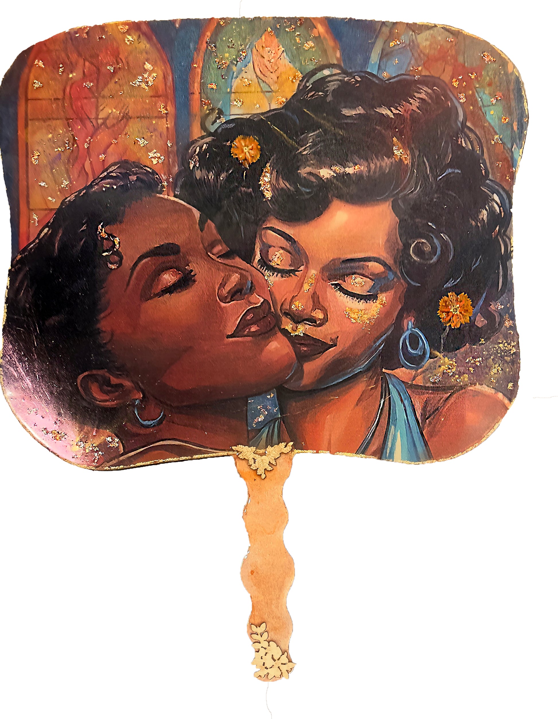 Fan is hand-poured in resin, adorned with real pressed flowers, gold leaf, and mixed media on wood